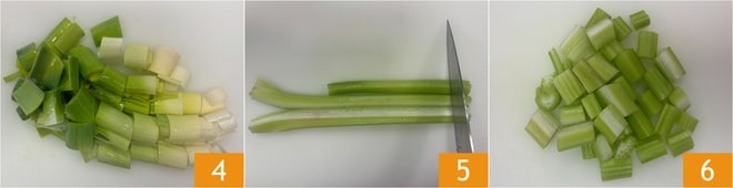 Elimina los extremos del puerro, divídelo por la mitad y córtalo en trozos 4, corta el apio primero por la mitad 5 y luego en trozos 6.