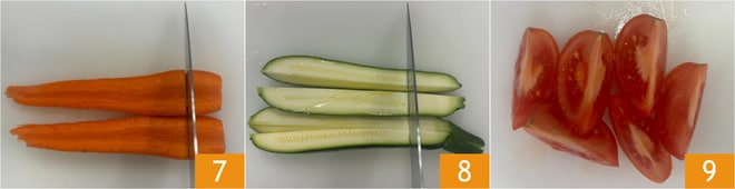 Lava y corta en trozos la zanahoria 7 y el calabacín 8. Lava y corta en gajos también los tomates en rama 9.