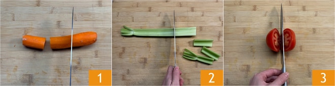 Para preparar el caldo de verduras, primero lava y limpia las verduras. Corta en trozos la zanahoria 1 y el apio 2. Divide los tomates por la mitad 3.