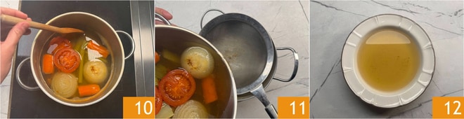 Lleva a ebullición 10 y deja hervir a fuego lento sin tapa, o con la tapa entreabierta, durante aproximadamente una hora. Prueba y, si es necesario, ajusta la sal. Transcurrido el tiempo de cocción, cuela el caldo a través de un colador 11. ¡El caldo de verduras está listo para ser utilizado en tus recetas 12!