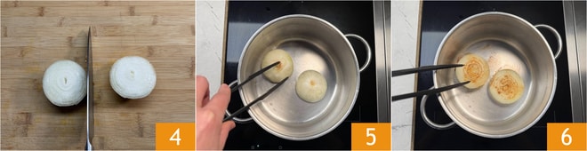 Haz lo mismo con la cebolla 4 y colócala en la olla con la parte cortada hacia abajo 5. Enciende el fuego y tuesta la cebolla durante aproximadamente un minuto y medio, cuidando de que no se queme. Luego, dale la vuelta y tuéstala otro minuto 6.