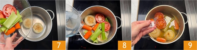 Agrega las otras verduras 7, luego vierte un poco de agua para desglasear el fondo 8. En este punto, cubre con el resto del agua y sazona con los granos de pimienta y la sal 9.