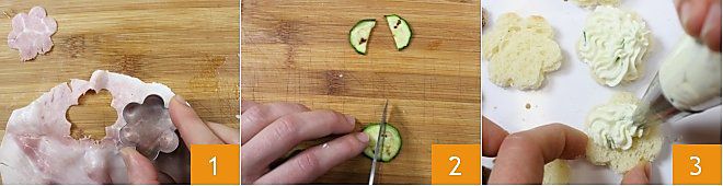 CANAPÉ DE JAMÓN COCIDO: Para preparar los canapés de jamón cocido, utiliza el molde en forma de flor para cortar 5 rebanadas de pan de molde 1 y 5 rebanadas de jamón cocido. Toma 3 rodajitas de calabacines asados previamente y córtalas por la mitad 2. Ahora compón las tartaletas colocando un rosetón de crema de hierbas en cada tartaleta 3 (si prefieres, también puedes utilizar la crema de gambas),