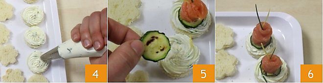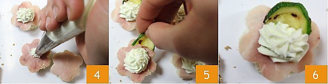 luego una rebanada de jamón, otro rosetón de crema 4 y finalmente decora con media rebanada de calabacín 5. ¡Los canapés de jamón cocido están listos! 6