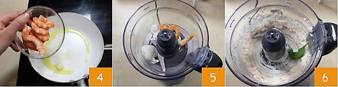 Cocina las gambas en la sartén, durante pocos minutos a fuego alto 4. Una vez cocidas, mezcla las gambas con una batidora junto con 50 g de Philadelphia 5, algunas hojas de albahaca, sal y pimienta al gusto, hasta obtener una crema densa 6.