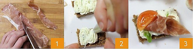 CANAPÉ DE JAMÓN CURADO: Para preparar los canapés de jamón curado, corta el jamón curado en tiras y enróllalas sobre sí mismas para formar florecillas 1, luego corta en cuartos dos tomatitos. Toma el pan de centeno, elimina la corteza con un cuchillo y corta 5 rectangulitos de unos 5 cm de largo (para obtener los rectangulitos puedes también utilizar los restos de pan sobrantes de la preparación anterior). Arma los canapés colocando un rosetón de crema de hierbas sobre cada rebanada de pan 2. Completa colocando una florecilla de jamón, un trozo de tomate y una hoja de albahaca 3.