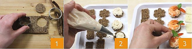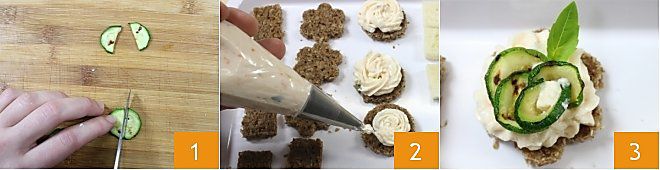 CANAPÉ DE CALABACINES Y CREMA DE GAMBAS: Para preparar los canapés de calabacines y crema de gambas, corta por la mitad las 10 rodajitas de calabacín asado que sobraron 1, decora los discos de pan de centeno con la crema de gambas 2 y decóralos con los calabacines para formar una flor y una hoja de albahaca 3. ¡Tus canapés de calabacines y crema de gambas están listos!