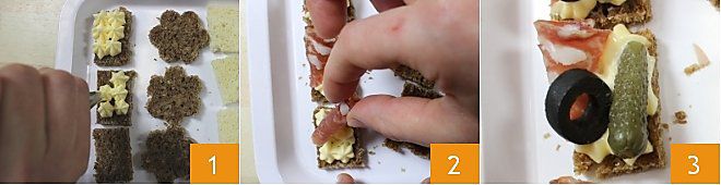 CANAPÉ DE SALAMI: Para preparar los canapés de salami, corta las rebanadas de salami en cuartos, corta 5 rectangulitos de pan de centeno como en la preparación anterior, utilizando también los restos de las preparaciones anteriores, corta una aceituna en rodajas finas, luego coloca la mayonesa en una manga pastelera. Arma el canapé colocando mayonesa en cada rebanada de pan 1 y un cuarto de rebanada de salami enrollada 2; finalmente decora con un pepinillo pequeño y una rodaja de aceituna 3. ¡Tus canapés de salami están listos!
