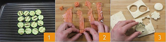 CANAPÉ DE SALMÓN: Para preparar los canapés de salmón, corta un calabacín en rodajas finas y ásalas durante unos minutos (debes obtener 18 rodajas) 1. Saca la piel de un limón con un pelador de patatas, y luego córtala finamente en juliana. Corta tiras de salmón de 1,5 cm de ancho y 7-8 cm de largo, y enróllalas sobre sí mismas para formar una rosita 2. Toma ahora el pan de molde blanco, elimina la corteza y, utilizando un cortapastas de 5 cm, corta 5 formas (nosotros utilizamos un molde de flor, como el de las canestrelli, y el círculo, pero puedes elegir la forma que más te guste) 3.