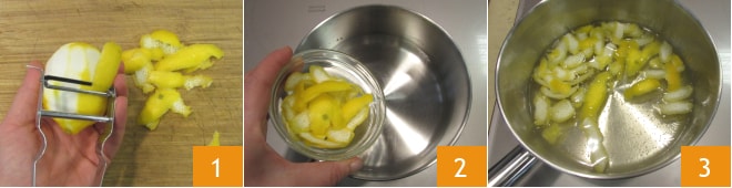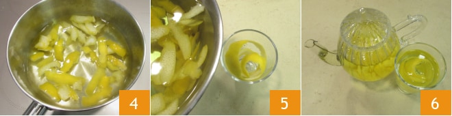 Para preparar el canario, primero lava bien el limón y saca la cáscara con un pelador, teniendo cuidado de evitar la parte blanca, de lo contrario la bebida resultará amarga 1. Vierte el agua en un cazo, añade la cáscara del limón 2 y lleva a ebullición, luego deja cocer a fuego lento durante unos 10 minutos 3.