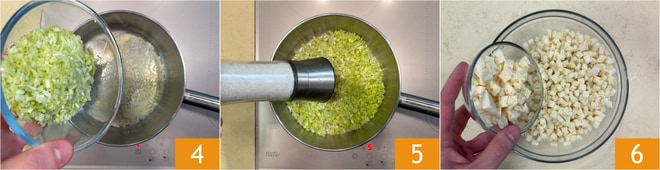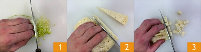 Para preparar los canederli al queso lo primero que hay que hacer es cortar finamente el puerro 1 y reservar. Corta el Puzzone di Moena, primero en rodajas 2 y luego en cubos de aproximadamente 1 cm 3. Corta también el pan duro en cubos del mismo tamaño que el queso.
