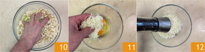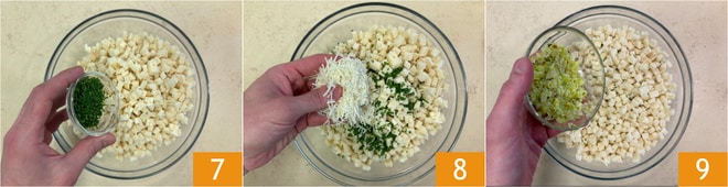 Agrega el cebollino finamente picado 7, el Trentingrana rallado 8 y mezcla con las manos, luego añade el puerro 9.
