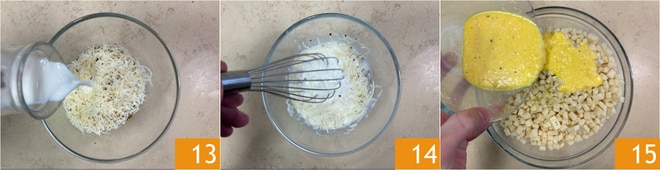Vierte aproximadamente la mitad de la leche 13, luego mezcla con un batidor 14; debes obtener una mezcla homogénea. Añade la mezcla obtenida al bol con el pan 15.