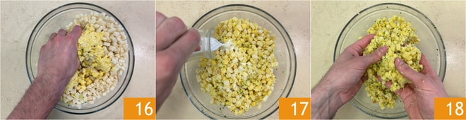 Mezcla bien con las manos 16. Si es necesario puedes añadir el resto de la leche 17; debes obtener una masa bastante húmeda pero que mantenga la forma 18.