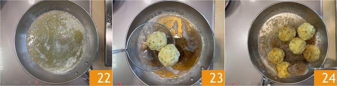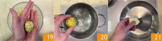 Con las manos humedecidas da forma a los canederli, que deben tener un diámetro de aproximadamente 5 cm 19; con estas cantidades obtendrás alrededor de 12. Cocínalos en agua hirviendo con sal durante unos 10 minutos 20. Es importante que el agua no hierva demasiado violentamente porque podría romper los canederli. Mientras tanto, en una sartén derrite la mantequilla 21.