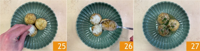Sírvelos y espolvorea con el Trentingrana 25, luego rocía los canederli con la mantequilla avellana 26 y completa con un poco de cebollino. ¡Tus canederli al queso están listos para ser degustados 27!
