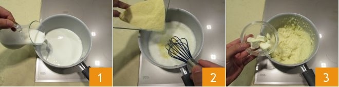 Para preparar las albóndigas de sémola, comenzad preparando el Caldo de carne. Luego, dedicad tiempo a la masa: en un cazo con fondo antiadherente y bordes altos, calentad la leche 1 hasta que casi hierva. Luego agregad la sémola en forma de lluvia 2, mezclando continuamente y enérgicamente con las varillas de mano para evitar la formación de grumos, durante aproximadamente 7-8 minutos. Después, apagad el fuego y sazonad con sal. Ahora añadid la mantequilla ablandada 3,