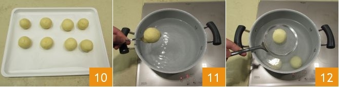 Colocad las albóndigas bien separadas entre sí en una bandeja forrada con papel de horno para que no se peguen 10. Ahora llevad a ebullición una cacerola grande con abundante agua salada y cuando haya hervido, echad 4-5 albóndigas a la vez 11: veréis que caen al fondo de la cacerola. Tan pronto como vuelvan a la superficie, estarán listas: con una espumadera, sacadlas 12. Coced también las restantes,
