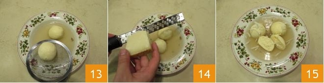 luego tomad los platos para las albóndigas de sémola y verted caldo de carne. Luego, con la espumadera, colocad en cada plato aproximadamente 2-3 albóndigas por porción 13. Espolvoread con el queso 14 y disfrutad de vuestras albóndigas de sémola aún calientes 15!