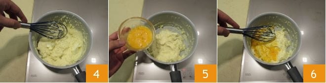 continuad mezclando para que se derrita en la mezcla caliente 4, luego verted un huevo batido 5. Mezcladlo también con los ingredientes 6.