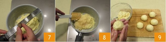 Aromatizad con la nuez moscada 7 y continuad mezclando: la mezcla debe tener una consistencia densa y compacta y desprenderse de los bordes del cazo 8. Dejad que se temple ahora para que se compacte. Cuando esté a temperatura ambiente, tomad aproximadamente 65 g y con las manos ligeramente humedecidas, formad una pequeña esfera 9. Repetid el proceso hasta terminar toda la masa: obtendréis 8 albóndigas.