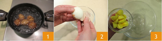 Para preparar los canestrelli de chocolate, comienza cocinando los huevos para que queden duros: necesitarán 8 minutos en agua hirviendo 1. En este punto, escurre los huevos, pélalos 2 y conserva solo las yemas. Pesa 70 g de yemas y transfiérelas a un bol 3.