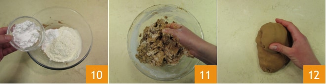 Incorpora también la harina y la fécula 10. Amasa con las manos hasta obtener una mezcla homogénea 11, luego transfiérela a una superficie y amasa durante un par de minutos más 12.