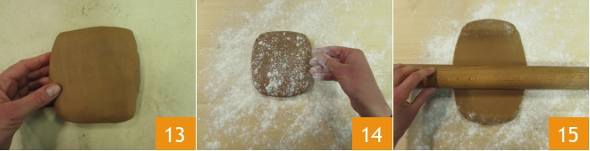 Forma un bloque 13, envuélvelo en film transparente y déjalo reposar en el frigorífico durante al menos 30 minutos. Pasado este tiempo, retoma la masa, colócala en una superficie enharinada y espolvorea ligeramente también el bloque 14. Extiende la masa con un rodillo 15 hasta obtener un grosor de 4 mm.