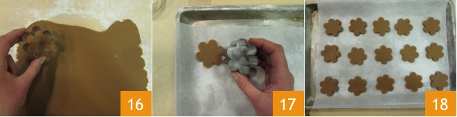 Usando un cortador con forma de flor de 5 cm, corta las galletas 16 y colócalas poco a poco en una bandeja cubierta con papel de horno 17. Vuelve a amasar los recortes, extiéndelos y córtalos hasta terminar toda la masa 18.