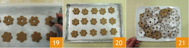 Usando una boquilla de 1 cm, realiza un agujero en el centro de las galletas 19. Hornea en el horno estático precalentado a 180° en la rejilla media-baja durante 15 minutos. Retira los canestrelli de chocolate 20 y déjalos enfriar completamente antes de decorarlos con azúcar glas y servirlos 21.