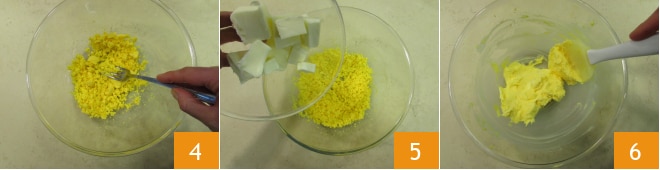 Machaca las yemas con un tenedor 4. Pica el chocolate y fúndelo al baño maría o en el microondas, luego deja que se temple. Agrega la mantequilla suave a las yemas 5 y trabaja con una espátula de goma hasta obtener una consistencia cremosa 6.