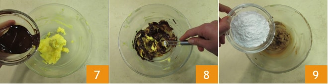 Incorpora el chocolate fundido templado 7 y mezcla la preparación con una espátula 8, luego añade el azúcar glas 9.