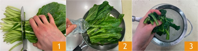 Para preparar los canelones rellenos de ragú de alcachofas y salchicha, lo primero que hay que hacer es cortar los tallos de las acelgas 1; resérvelos porque servirán para el ragú. Coloque las hojas de las acelgas en una olla con medio vaso de agua 2, cubra con una tapa y deje cocer durante 2 minutos. Escurra y deje enfriar un poco, luego exprima bien las acelgas para eliminar la mayor cantidad de agua posible 3.
