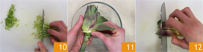 Corte finamente los tallos de las acelgas 10 y luego dedíquese a la Cómo limpiar las alcachofas: elimine las hojas exteriores más duras 11, luego corte las puntas 12.