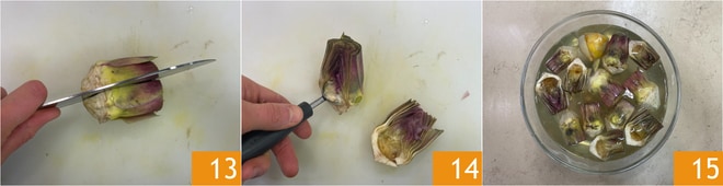 Divida las alcachofas por la mitad 13 y elimine la pelusa 14. A medida que las limpie, sumérjalas en agua acidulada 15.