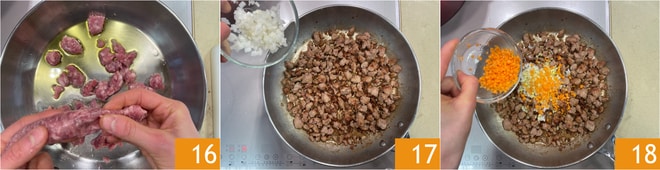 En una sartén, caliente un chorrito de aceite, luego desmenuce la salchicha 16 y sofríala a fuego medio. Cuando comience a dorarse, agregue la cebolla 17, el apio y las zanahorias que previamente habrá picado finamente 18. Cocine por un par de minutos.
