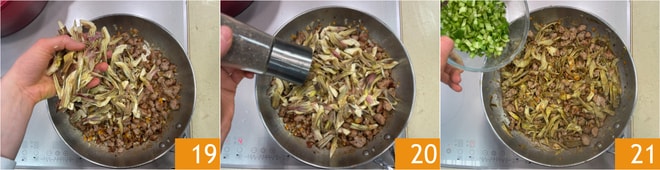 Corte las alcachofas en rodajas finas y únelas a la sartén 19, luego salpimiente 20 y cocine durante 10 minutos. En este punto, agregue los tallos de las acelgas 21 y mezcle.