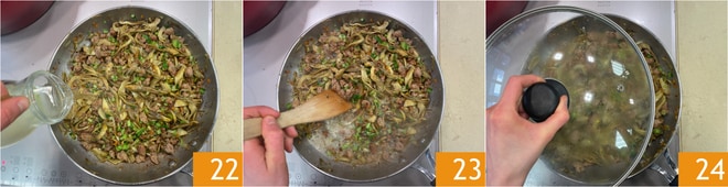 Desglase con el vino blanco 22 y desglase la sartén raspando el fondo con una cuchara de madera 23. Reduzca el fuego, cubra con una tapa dejando una pequeña apertura 24 y cocine durante unos 20 minutos. Pasado este tiempo, apague el fuego y deje enfriar completamente.