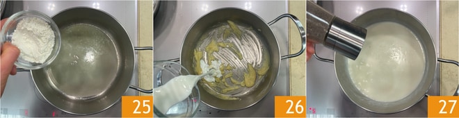 Mientras tanto, dedíquese a la preparación de la bechamel: derrita la mantequilla en una cacerola, luego agregue la harina 25 y mezcle rápidamente. Cuando haya obtenido un roux rubio, vierta la leche poco a poco 26, mezclando continuamente para eliminar los grumos. Lleve a ebullición y apague el fuego; deberá quedar bastante líquida. Regule de sal y de pimienta 27.