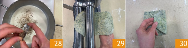 Finalmente, aromatice con la nuez moscada 28. Retome la masa y corte una porción; mantenga cubierto el resto para que no se seque. Estire la masa con una máquina de pasta, comenzando con el grosor más grande 29 y haciendo pliegues, especialmente durante los primeros pasos 30.