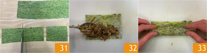 Continúe de esta manera hasta llegar al grosor más fino y hasta agotar la masa; deberá obtener láminas de aproximadamente 1 mm de espesor. Corte las láminas en rectángulos de 10x14 cm 31. Rellene los rectángulos con abundante relleno 32 y enróllelos 33.