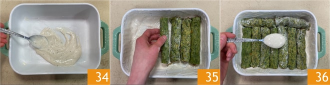 Unte con mantequilla una fuente para hornear y vierta en el fondo aproximadamente la mitad de la bechamel, cubriendo también los bordes 34. Coloque los canelones en la fuente con la parte del cierre hacia abajo 35 y luego cubra con la bechamel restante 36.