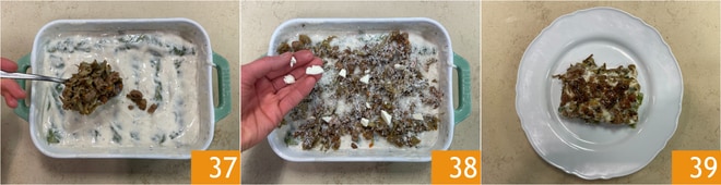 Distribuya en la superficie el resto del ragú de alcachofas y salchicha 37, luego complete con el Parmigiano rallado y unos trocitos de mantequilla 38. Hornee en un horno estático a 180° durante 20-25 minutos, si es necesario, los últimos 2-3 minutos puede pasarlos a modo grill. ¡Los canelones rellenos de ragú de alcachofas y salchicha están listos para ser servidos 39!