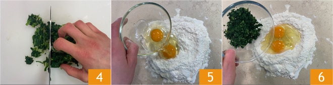 Pique finamente con un cuchillo 4. En la superficie de trabajo, disponga la harina y la sémola en forma de fuente, luego vierta en el centro los huevos 5 y las acelgas 6.