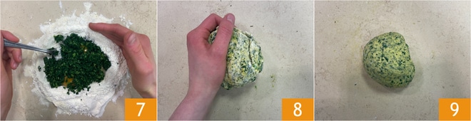 Incorpore la harina primero con un tenedor 7, luego con una rasqueta y finalmente amase con las manos 8 hasta obtener un panecillo liso y homogéneo 9. Deje reposar a temperatura ambiente durante 30 minutos, cubierto con un bol.