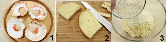 Para preparar las vieiras gratinadas a la provenzal, comenzad colocando las vieiras en una bandeja de horno con la concha hacia abajo 1. Para que se mantengan rectas y evitar que el relleno se salga de la concha, podéis hacer un soporte de esta manera: cortad hojas de aluminio de 20 cm de largo y enrolladlas sobre sí mismas hasta obtener un bastón que uniréis por los extremos dándole forma de anillo, colocadlo debajo de cada vieira. Preparad el relleno: quitad la corteza del pan pugliese y reducidlo a migas con la ayuda de un batidor, luego ponedlo en un bol y añadid el parmesano rallado y el ajo machacado (2-3).