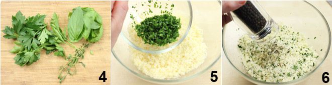Tomad ahora las hierbas (perejil, albahaca, mejorana y tomillo) y picadlas 4. Mezcladlas con el pan 5, salpimentad 6