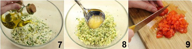 y añadid el aceite reservando unas cucharadas 7. Para amalgamar mejor todo, añadid el caldo vegetal hasta obtener una mezcla densa, ni muy líquida, ni muy sólida 8. En este punto, cortad los tomatitos en cubos 9