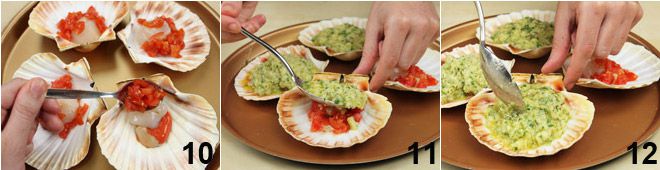 y colocadlos sobre las vieiras 10. Finalmente, cubrid las vieiras con la mezcla de migas y hierbas (11-12) y rociadlas con el aceite restante. Meted en el horno caliente para gratinar a 250° durante 20-25 minutos, hasta dorar la superficie. ¡Servid las vieiras gratinadas a la provenzal bien calientes!