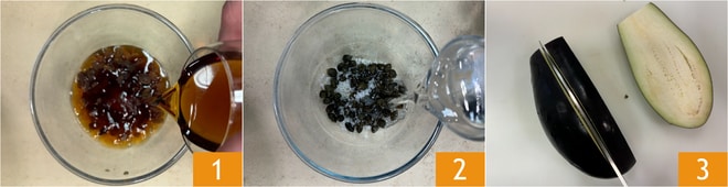Para preparar la caponata de berenjenas con salsa de cacao, lo primero que hay que hacer es poner las pasas en un bol y cubrirlas con Marsala 1, deberán hidratarse durante 30 minutos. Pon a remojo las alcaparras en agua 2 durante al menos 10 minutos. Lava y corta las berenjenas en rodajas 3.